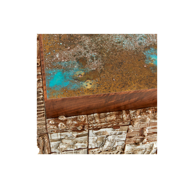 The Stellar Cube side table is entirely handmade, each ceramic tile and Verdigris copper top is individually crafted so no two pieces are the same. The inconsistencies ensure that each piece remains unique and they are the signature of the Stellar Collection.