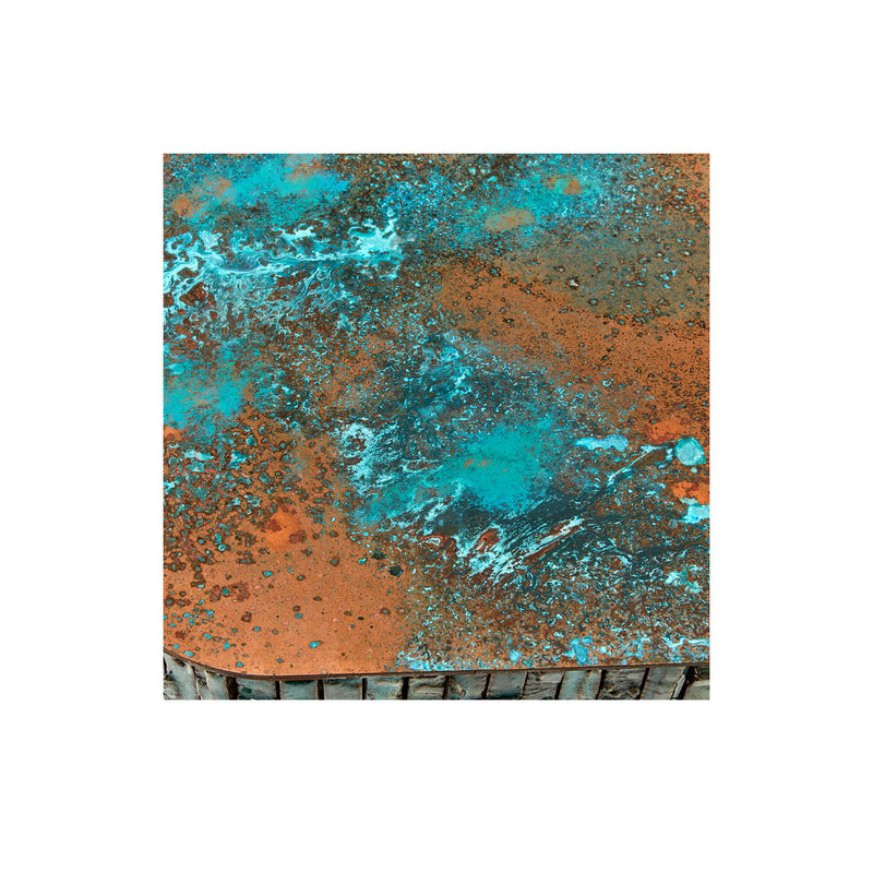 The Boogie Night's side table is entirely handmade, each ceramic tile and Verdigris copper top is individually crafted so no two pieces are the same. The inconsistencies ensure that each piece remains unique and they are the signature of the Collection. Top is carried by and antique copper burnished base.